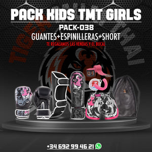 Pack creado para ofrecer una combinación de excelentes productos, conformado por, guantes, espinillera,pantalón corto, bucal y venda. Producto confeccionado con piel sintetica de alta calidad Excelente para los jóvenes talentos de las artes marciales,con una bonita combinacion de colores, entre negro, gris y rosal. Especial para muay thai y kick.